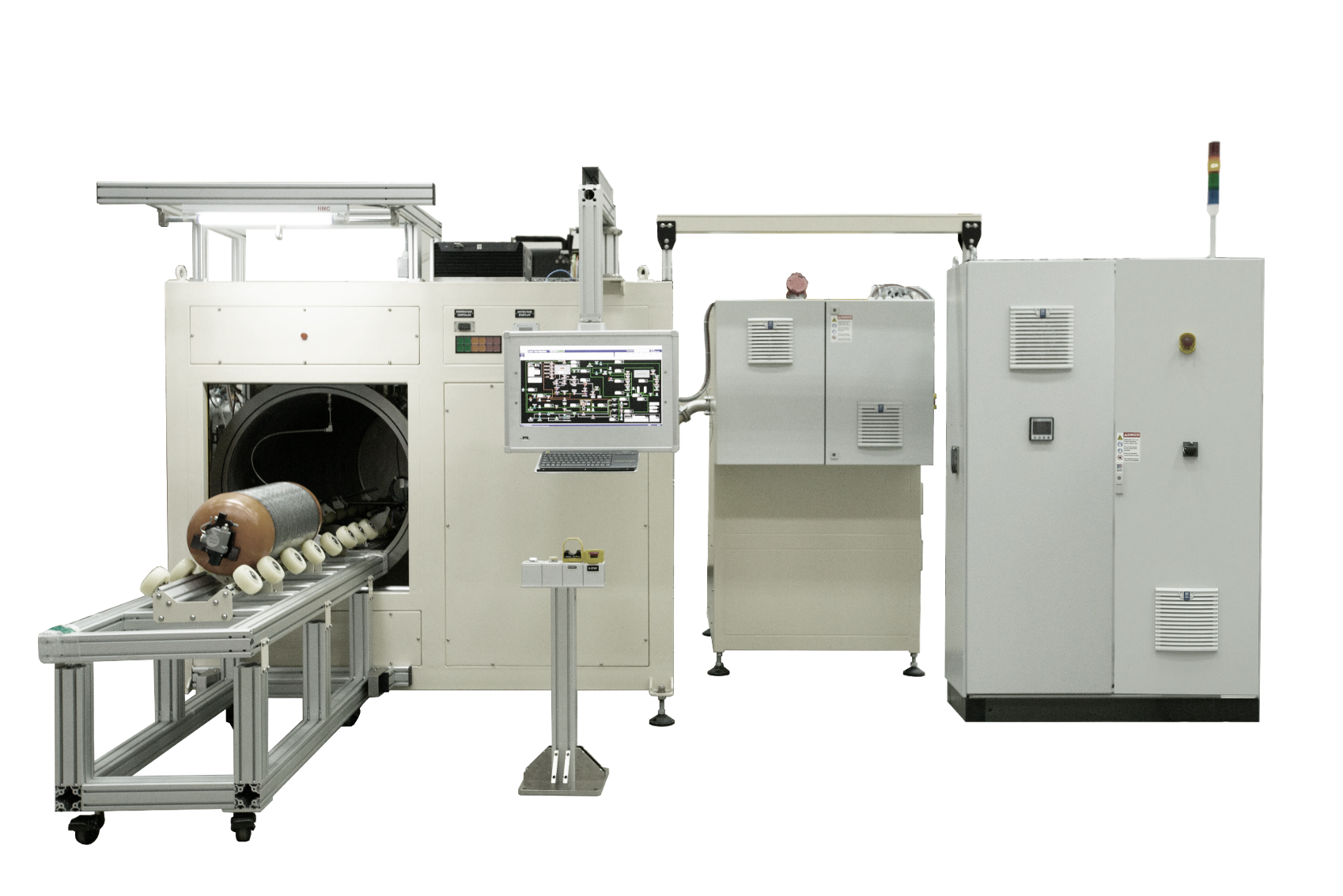 Nolek partnered with Donghee in Korea to develop a massive Inside-Out Hard Vacuum leak test system for 175L Hydrogen tanks. Operating at pressures up to 875 bar, this specialized workstation manages complex charging and discharging sequences while providing precise temperature control, ensuring the absolute safety and integrity of future-ready clean energy storage.